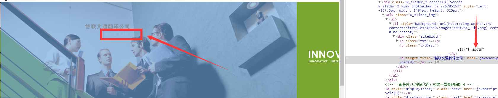 轮播图上出现了alt=翻译公司,这说明你这个图片alt标签加的不是对的地方需要从新更改下