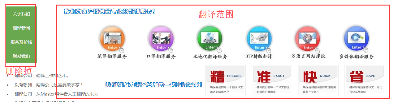 左侧绿色的导航栏目可以去除掉,首页红框标识的地方版块修改为翻译范围把你内页的翻译范围调取出来放到这个版块,一定是要文字的格式而不是图片